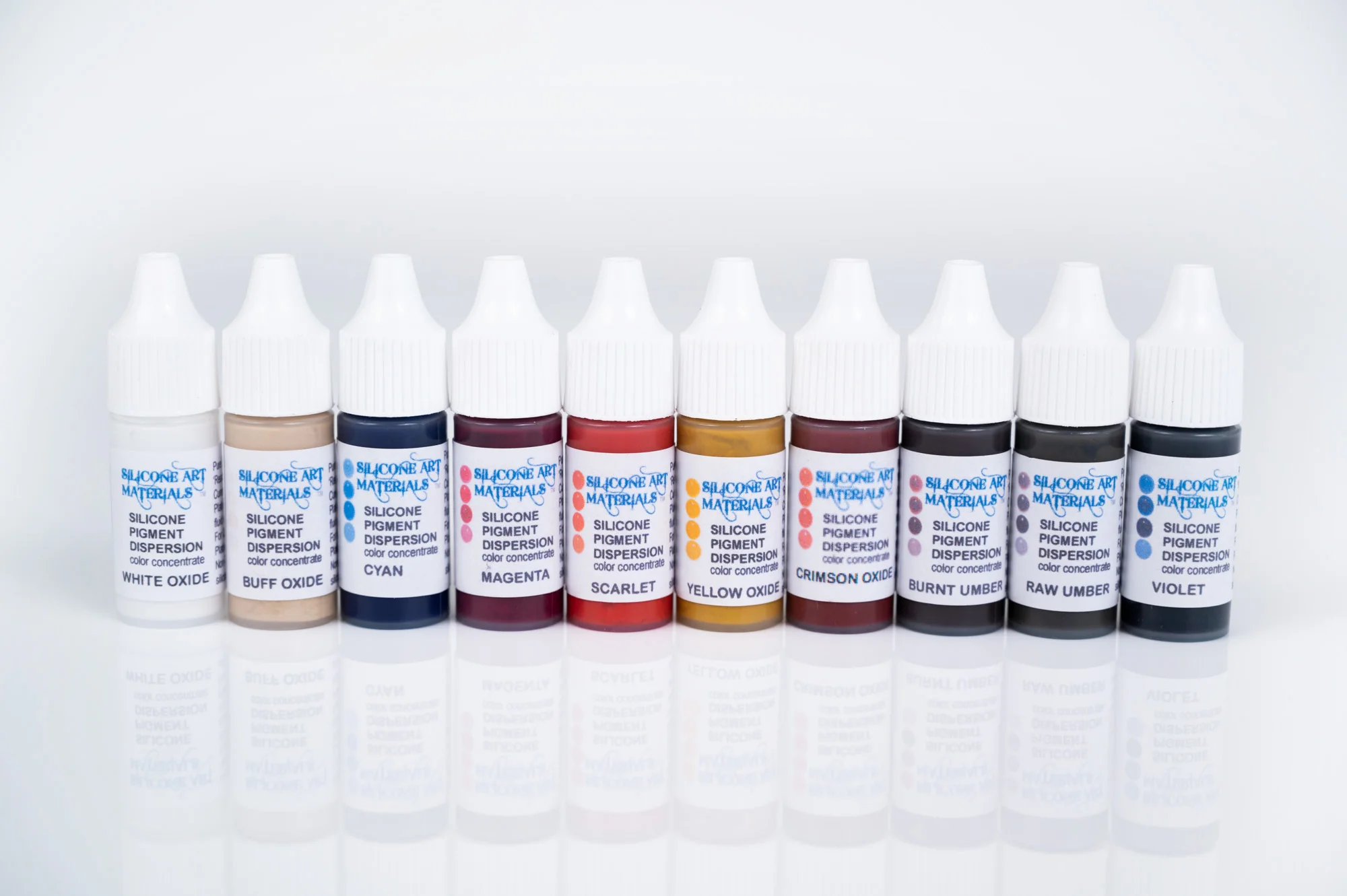 Pigment Dispersions are silicone-safe pigments dispersed in a silicone fluid. These are best for colouring large amounts of silicone, large batches of paint and delicate washes. Liquid Dispersions are easiest to use and mix right into liquid silicone.